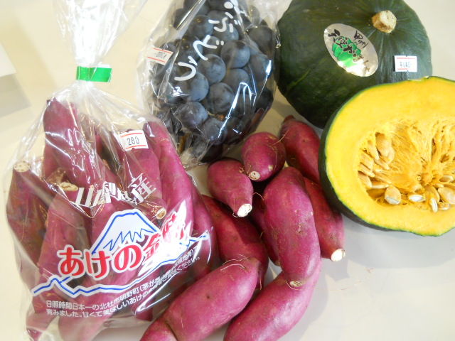 秋野菜のカレーに天空かぼちゃの煮物、あけの金時の天ぷらと食後のデザートにぶどう