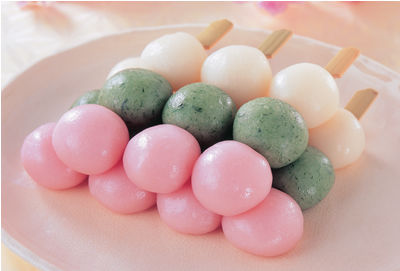 なんとも可愛らしい3色のお団子ちゃんたちが、串にささって1列に並んでおります。