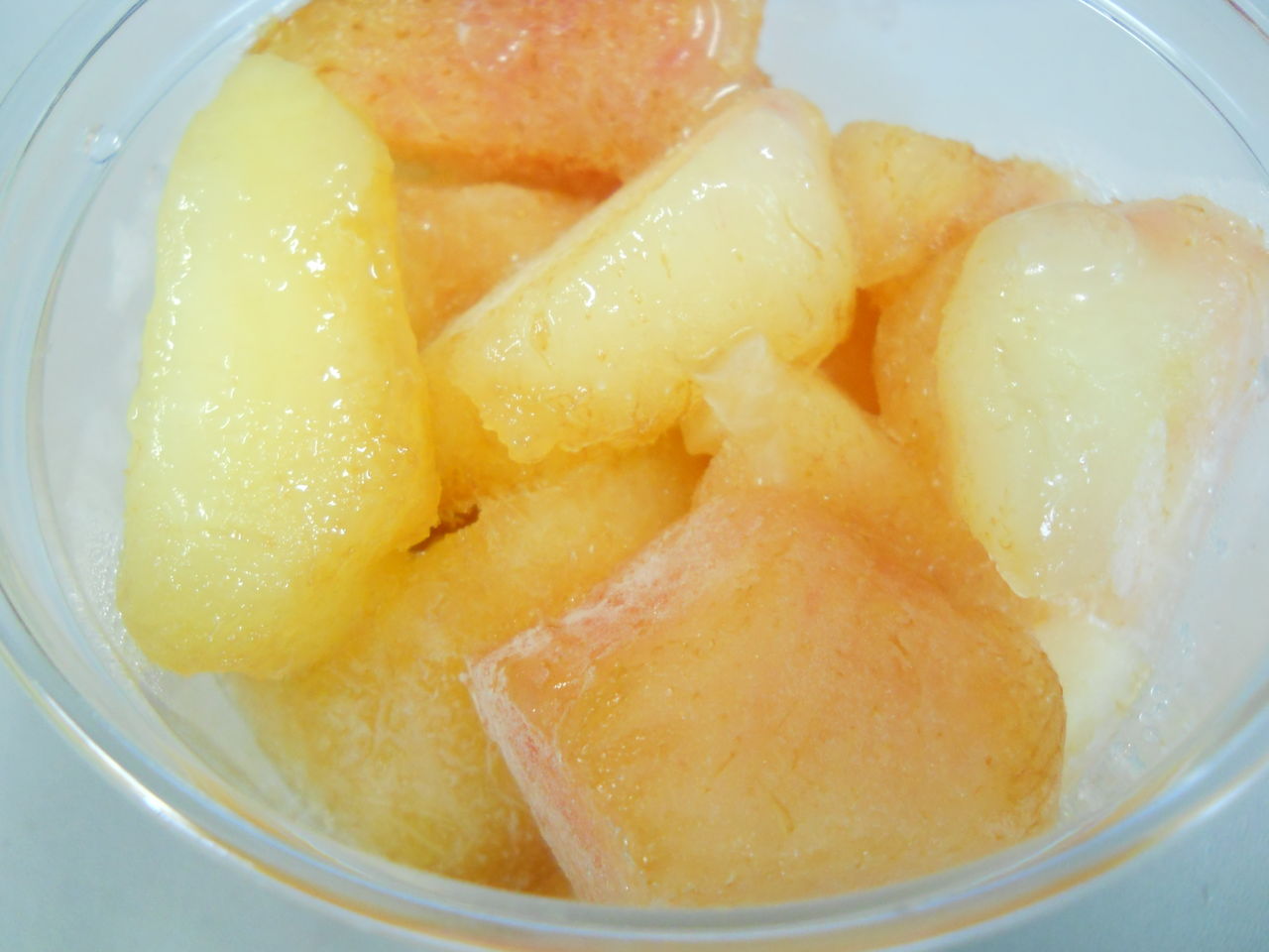 ・・・桃が凍ってしまった・・・これが噂の桃ソルべ! 注)こんなに早く凍りません。