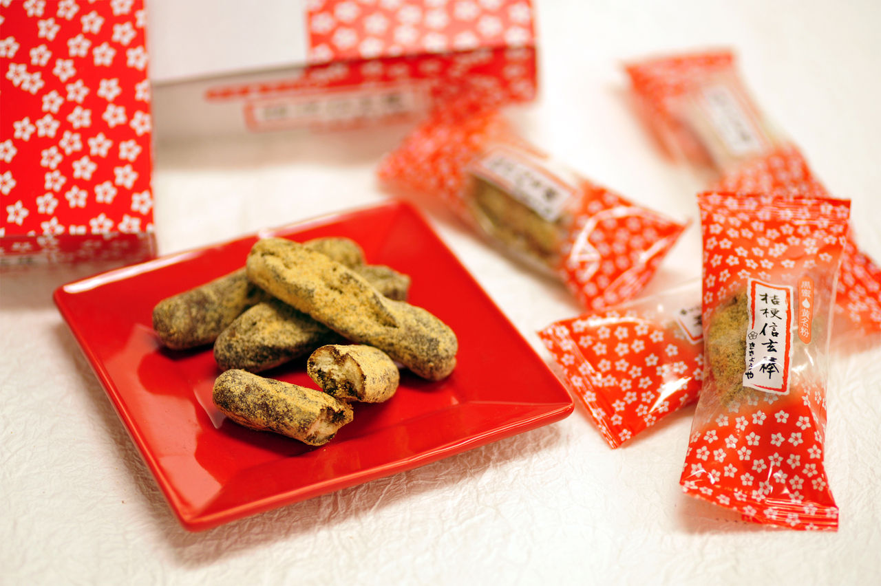 そう、きな粉が練りこんであり、こだわりの黒蜜がた~っぷりとしみこんでいる【桔梗信玄棒】。しかも40個入りです。
