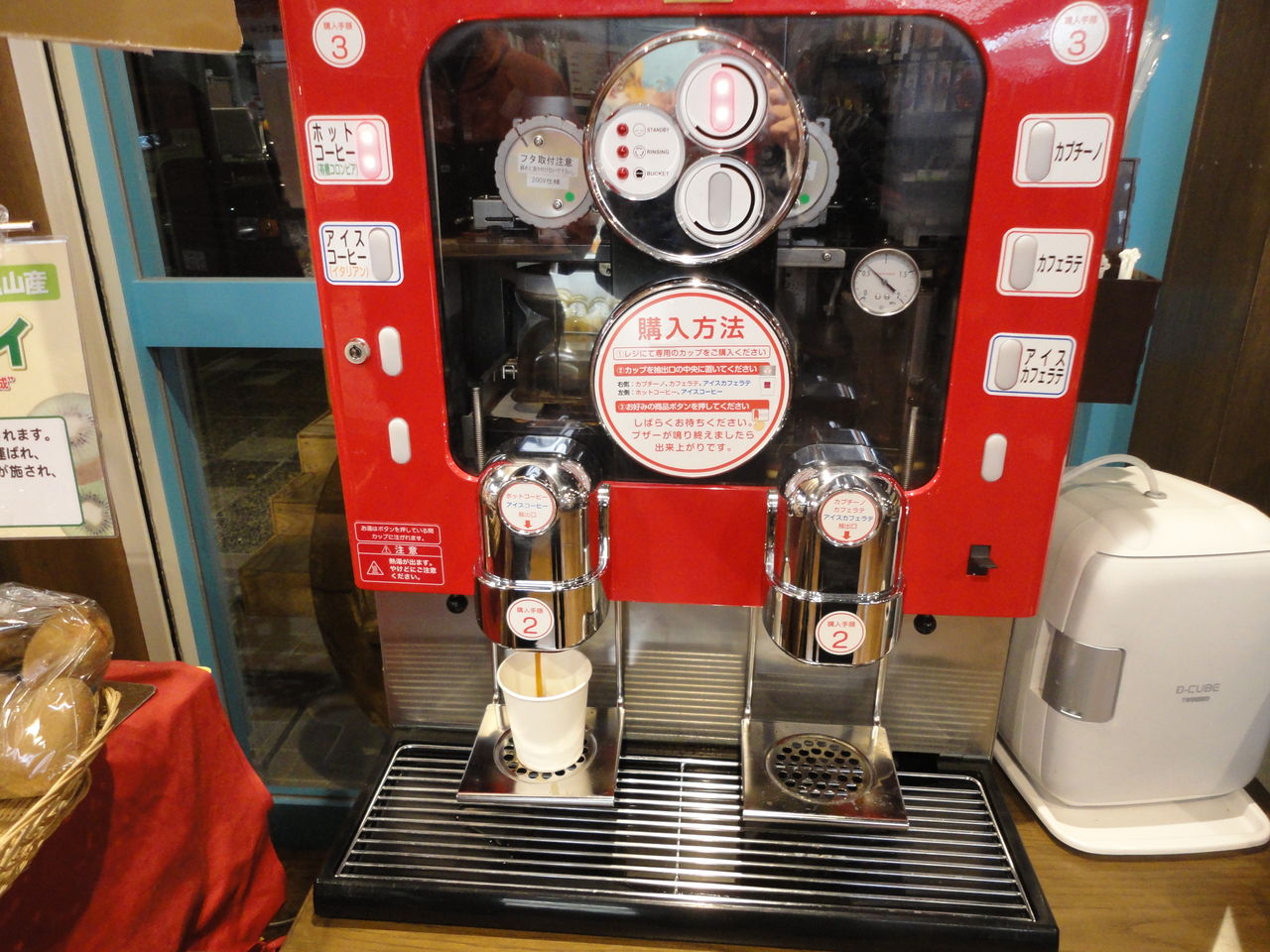 カップを赤いコーヒーマシーンに準備しお好みボタン押すと、