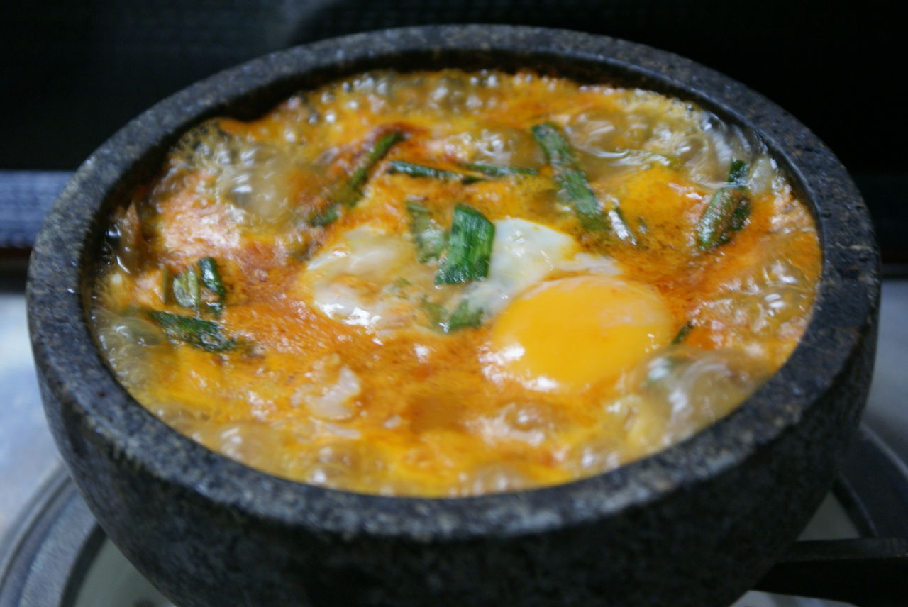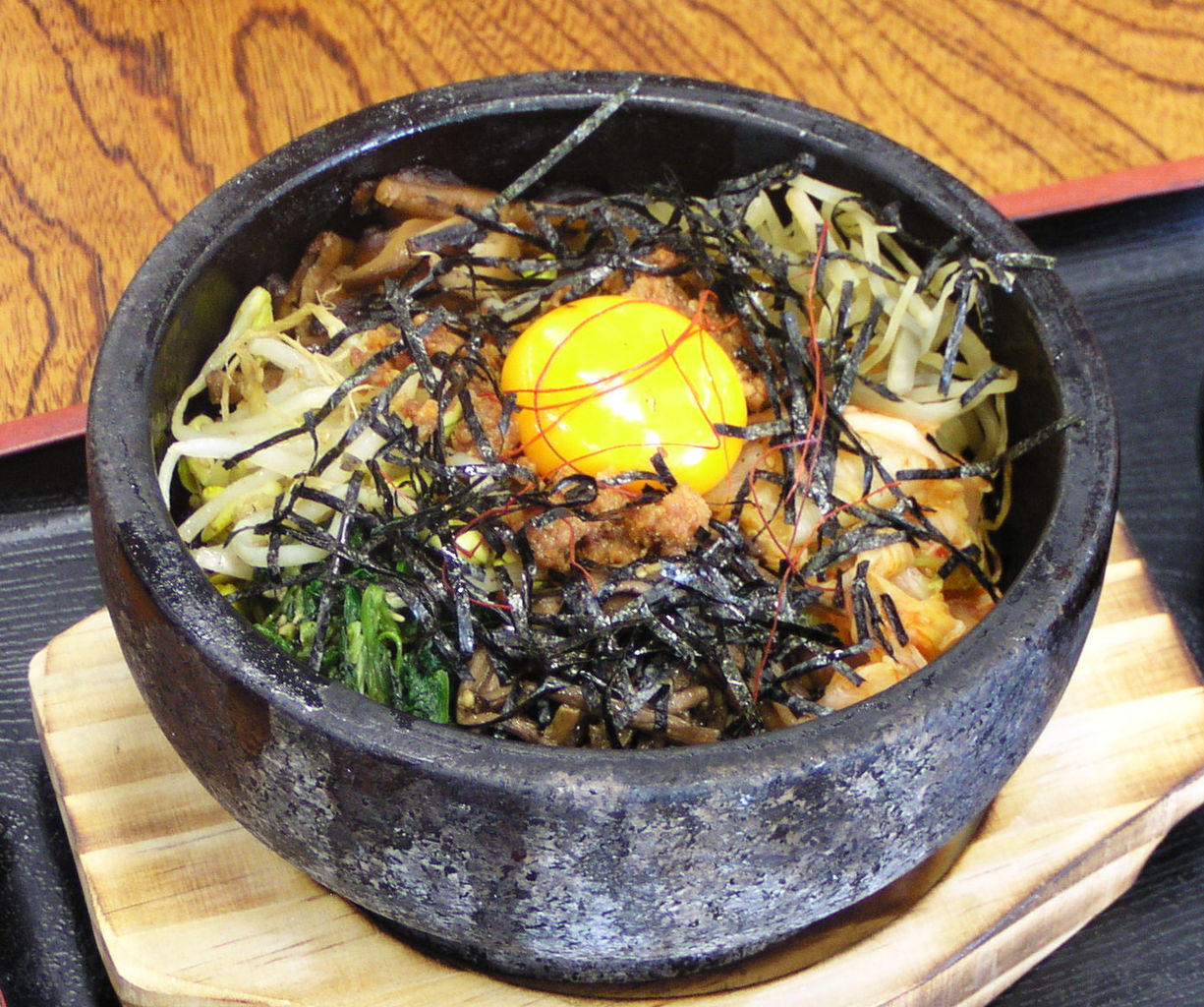 その大窓は、今の時期は寒いので閉まっている為、店内においしい匂いがこもっているのです。他のメニューももちろんいい匂いで食欲が出てきますが、ビビンバとスタミナキムチ雑炊は別格ですね(笑)。厨房から、できたてのビビンバが出てくる時のあの石が焼けている「ジュ~ッ」という音、スタミナキムチ雑炊は、お客様の目の前でアツアツに焼けた石にテグタンスープを入れた瞬間・・・何とも言えない、いい音といい匂いが「ウワァ~ッ」と来て店内に広がるのです。こうやって書いている最中にも、想像しただけで食べたくなってしまいます。