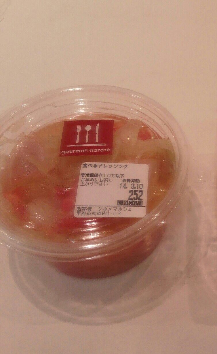 2014年03月10日 食べるドレッシング 公開済み: 2014年3月10日更新: 2014年3月10日作成者: スタッフカテゴリー: 桔梗信玄餅工場テーマパークブログ 季節は冬から春に変わって、グルメマルシェのメニューも色々変わってきました。新メニューも出ましたよ。 「食べるドレッシング」です。 名前を聞いて、ん?と思う人も多いはず。 実はドレッシングといっても、沢山の玉ねぎスライスが入っているんです。さらにロースハムやトマトも入っているので少量のサラダの上にかけても食べごたえ充分。 サラダだけでなく、パンにのせてもおいしいんですよ。 ぜひ試してみてください。 HATANO
