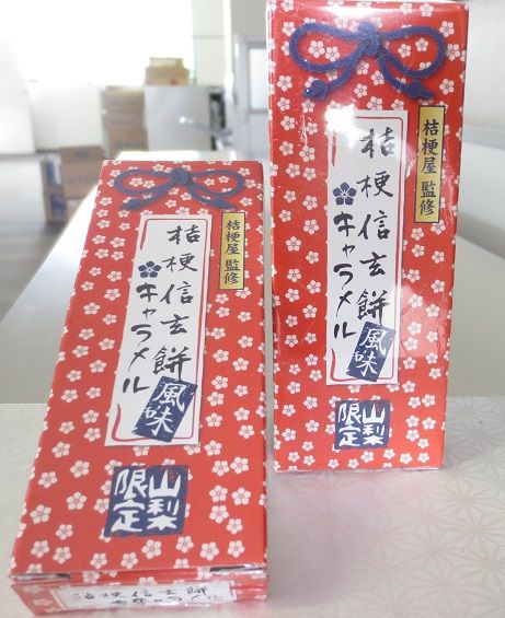 お土産に桔梗信玄餅を買いに来たというお客様は、「桔梗信玄餅以外にもいろいろあるのですね」と、お土産を迷っている様子でしたので、「今日から販売開始の最新作です」と桔梗信玄餅風味キャラメルをご案内すると、パッケージがかわいいと喜んでいただけました。