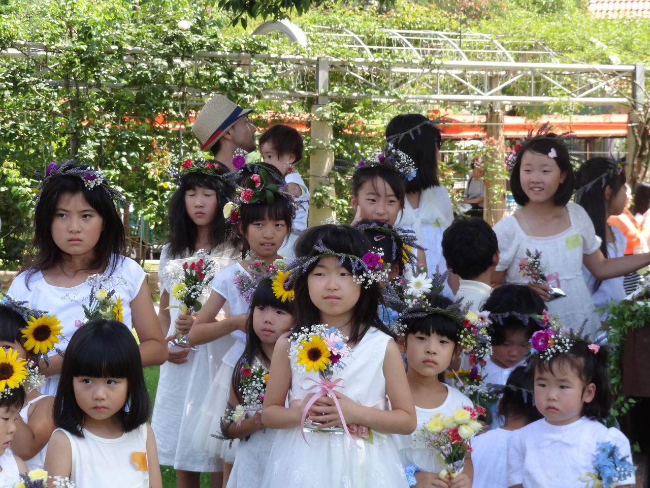 できた花冠とブーケを持って園内をパレードし、その後ファッションショーも行いました。スタッフの方から、舞台の上でポーズするよう言われた時は、「恥ずかしいから、ファッションショーは嫌だ」と言っていた娘たちも、他の子供たちがやっているのを見ていたら、「2人だけではなく友達も一緒だったらいいかなー。」とだんだんやる気になって、最後はご機嫌でポーズをとっていました。