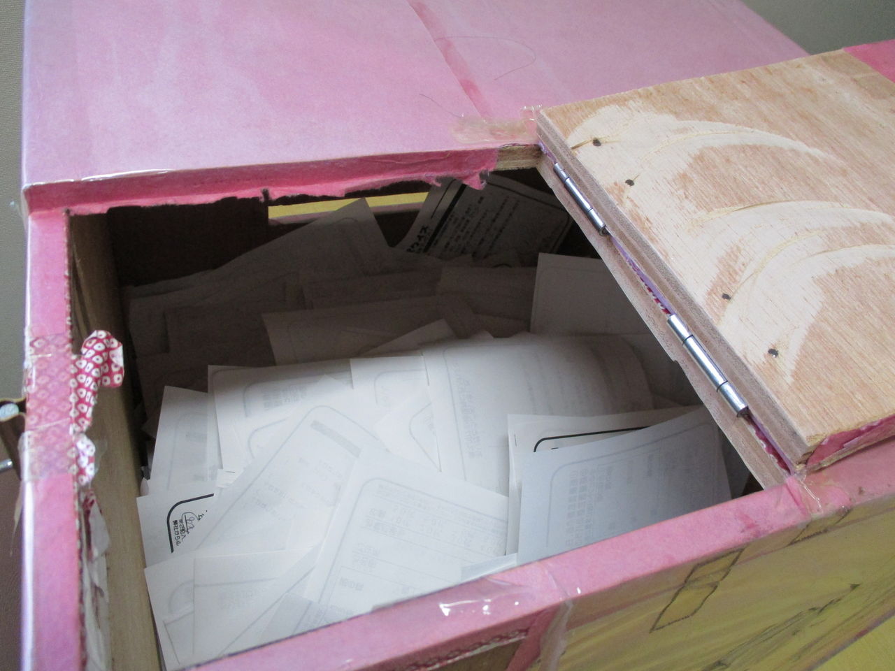 第14回桔梗屋工場祭りも無事終了し、ホッと一息つきたいところですが、実はまだまだ大切な作業が残っているのです。工場祭りの会場で一番注目を浴びた数当てクイズ。その正解者の確認作業です。両日とも、多くのお客様が一生懸命に数を数えてこの数当てクイズに参加してくれました。日曜日、祭り終了後に中身が気になり応募箱を開けてみました。日曜日だけでこんなにたくさん。