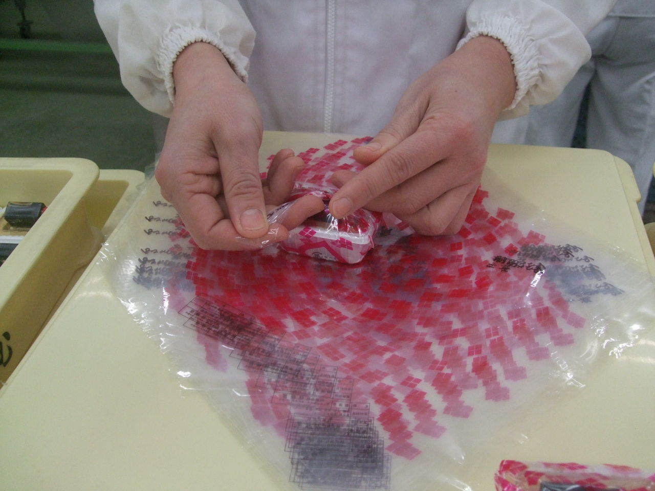 実は桔梗屋の工場内では包装体験というものがあります。