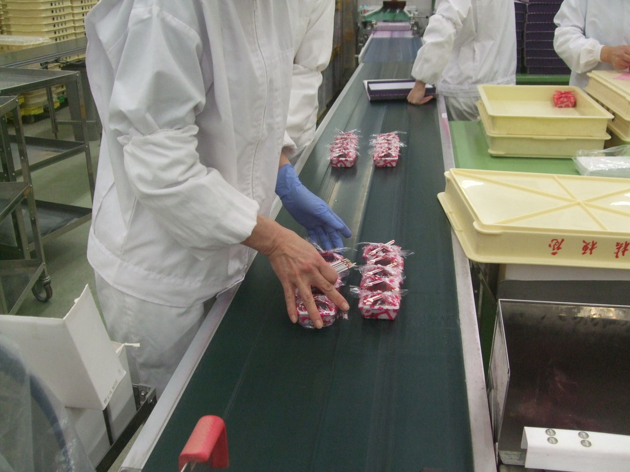 2017年03月20日 揃え作業 公開済み: 2017年3月20日更新: 2017年3月20日作成者: スタッフカテゴリー: 桔梗信玄餅工場テーマパークブログ 私が所属している製造5課では、桔梗打信玄餅の箱詰め作業と巾着袋入れ作業を 効率よく進めるためにベルトの上で桔梗信玄餅をそろえる作業を毎日行なっています。 桔梗信玄餅を5個ずつ揃えている所です。 また巾着袋に入れる際は6個ずつ、または8個ずつに揃えます。 こうして従業員たちのチームワークがあって桔梗信玄餅がお客様の手に届く様になるのです。 工場見学にお越しの際は、桔梗信玄餅を揃える作業にも注目してみて下さい。 製造5課 上條