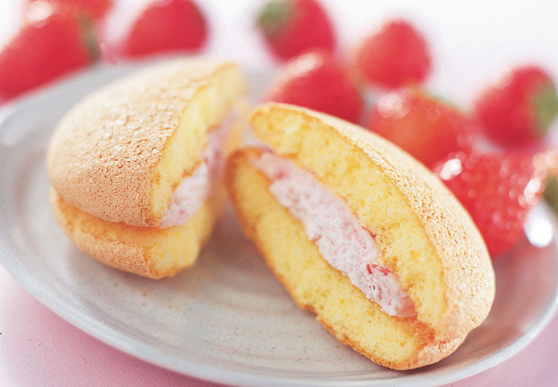 ふわふわのブッセで、甘酸っぱい苺クリームがサンドされています。