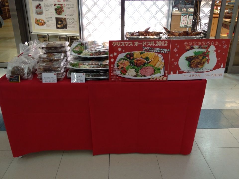 2012年12月23日 通路販売 公開済み: 2012年12月23日更新: 2012年12月23日作成者: スタッフカテゴリー: 桔梗信玄餅工場テーマパークブログ グルメマルシェでは12月22日から24日にかけてエクラン通路にて、クリスマスチキン!クリスマスオードブル!サンタクロース焼印入り黒糖どら焼きを販売してます。 通路販売していると、目の前にはサンタクロースの格好をした人がたくさん歩いて来たりと、クリスマスムード真っ盛り‼ 私もオードブルとチキンを買ってクリスマスパーティだぁ‼ 阪野