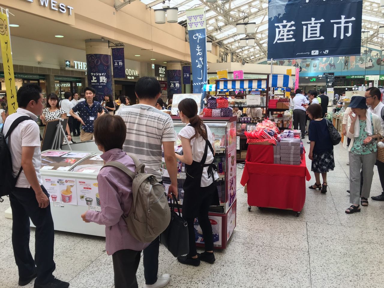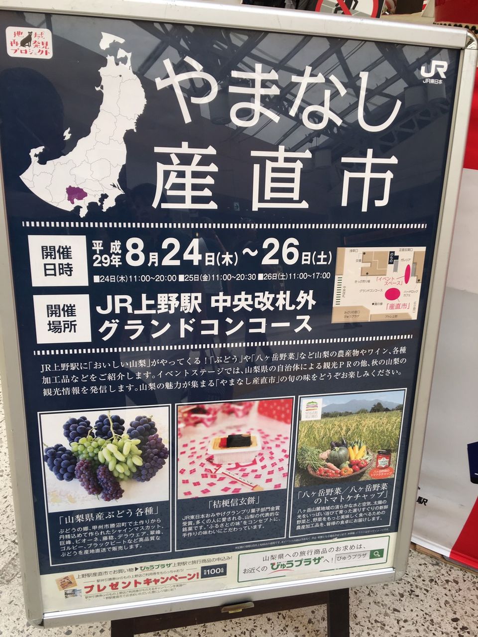 2017年08月24日 山梨産直市開催中 公開済み: 2017年8月24日更新: 2017年8月24日作成者: スタッフカテゴリー: 桔梗信玄餅工場テーマパークブログ 本日よりJR上野駅中央改札外グランドコンコースにて山梨産直市を開催してます。 桔梗信玄餅や人気の桔梗信玄生プリン、桔梗信玄餅アイスなど山梨の土産品の販売。また農産物やワイン等の販売。 そして自治体による観光PRの他、秋の山梨の観光情報を発信します。 初日からたくさんのお客様がいらしております。 私も山梨の魅力を伝えられるよう3日間がんばります。 上野駅ご利用の際は、山梨の魅力が集まる【やまなし産直市】の旬の味をどうぞお楽しみください。 営業本部 わたなべ
